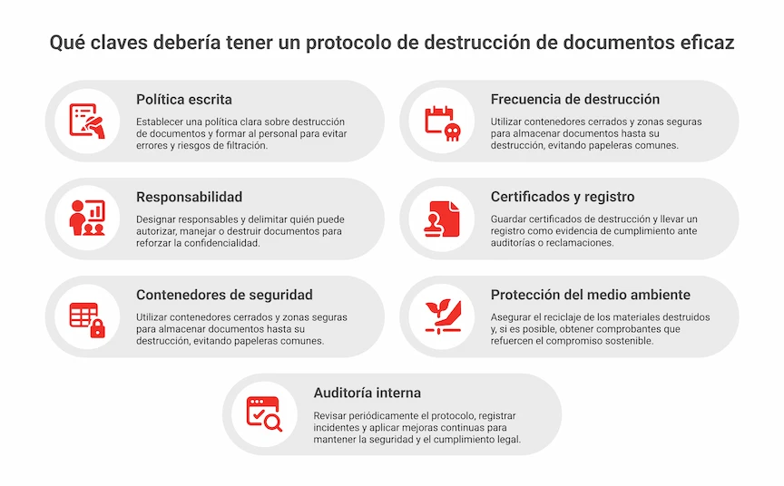 Lo más importante es que el protocolo de destrucción de documentos debe ser claro y fácil de implementar. Debe incluir: